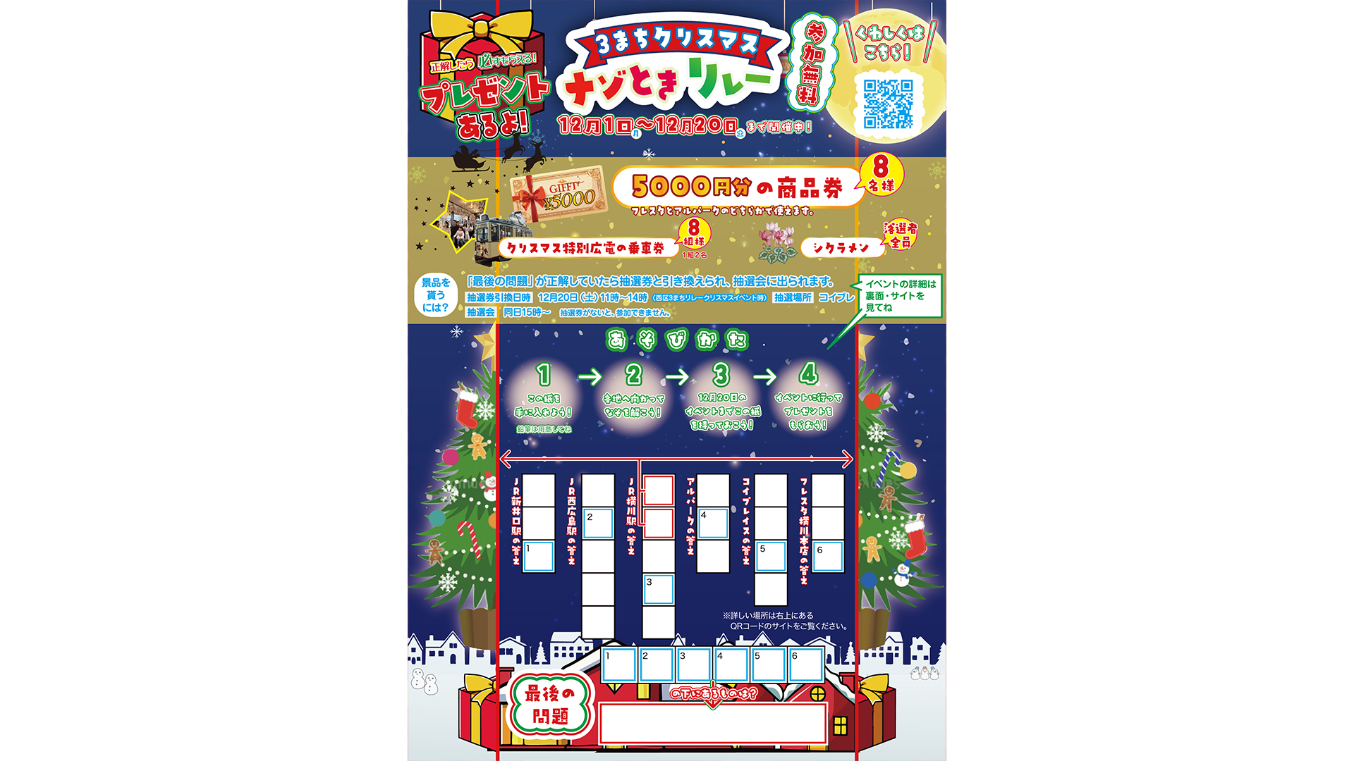 12月1日~20日開催!広島市西区の「井口・横川・己斐」の3つの街を巡る無料の謎解きラリー。ナゾを解いて、12月20日の抽選会で5000円の商品券や広電の乗車証など豪華景品をゲットしよう!