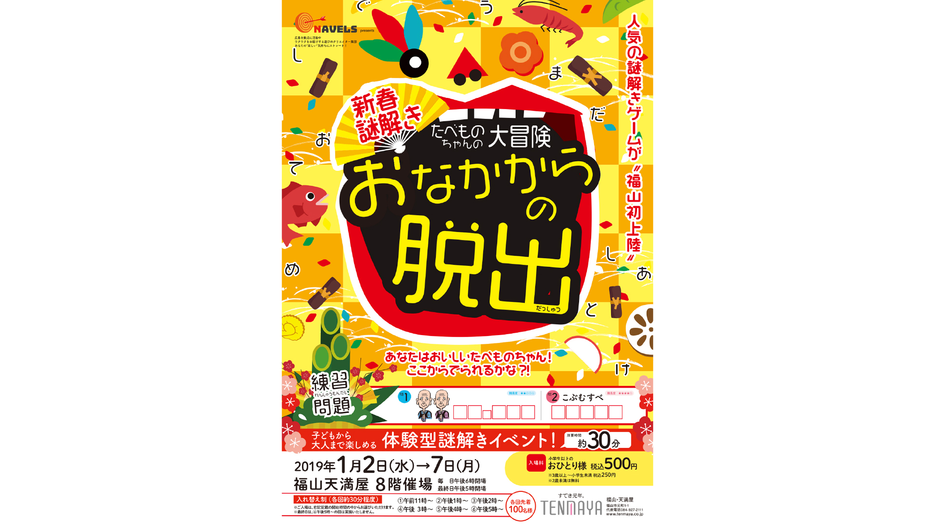 参加者が「食べ物」となって体の中を巡りながら最終的にどうなるのかを伝えながら進めていく。 入り口は大きな口のビジュアルを作り、部屋の中は体内となっている。善玉ちゃん(善玉菌)、悪玉くん(悪玉菌)の言葉を聞きつつ、食道や胃など関連する謎を解いていく。最後にはトイレに行って・・・ 5日間会場にて、1日全6回行い(一定時間ごとに開催)毎回満員となる人気のゲーム。
